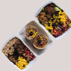 Carne mechada, arroz integral, choclo, pebre, cebolla caramelizada, salsa bbq, aceitunas negras